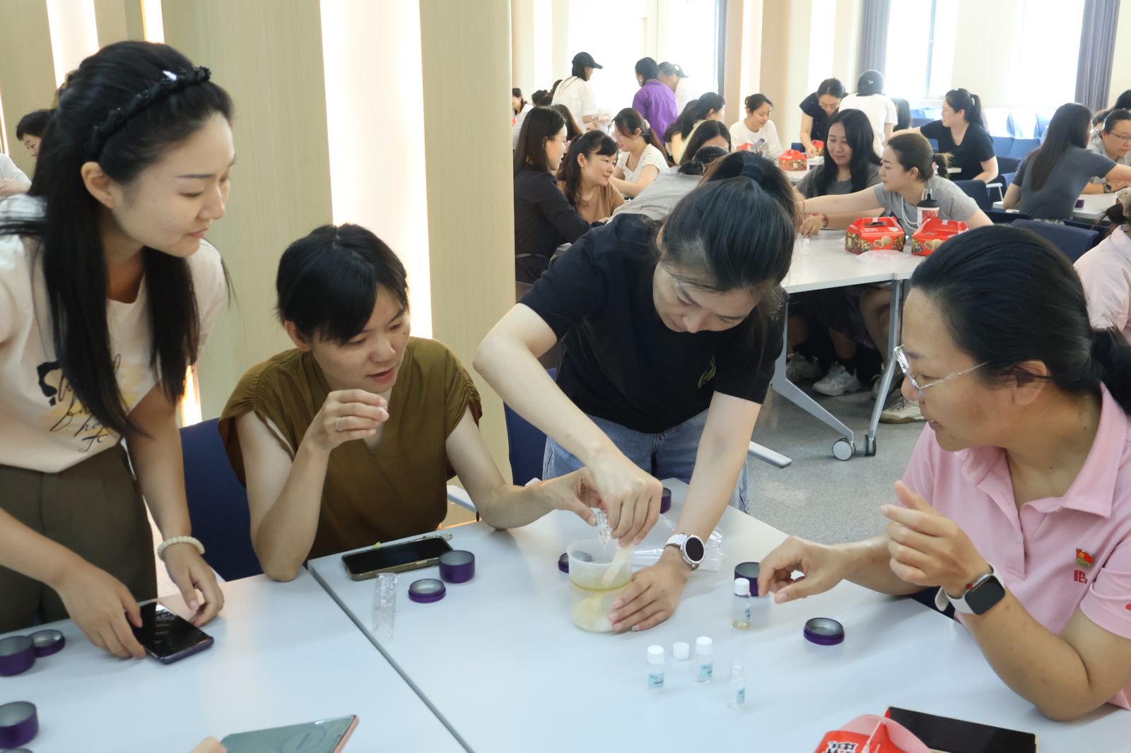 在最受期待的手作环节,以6-8人为一组制作护手霜。教工们在专业指导下将精油纯露、保湿剂、乳化剂等原料混合,进行搅拌、静置等步骤。老师们手持搅拌棒顺时针缓慢搅动,原本分离的液体渐渐融合成细腻的乳霜,活动现场弥漫着精油香气,一瓶瓶精油护手霜新鲜出炉。