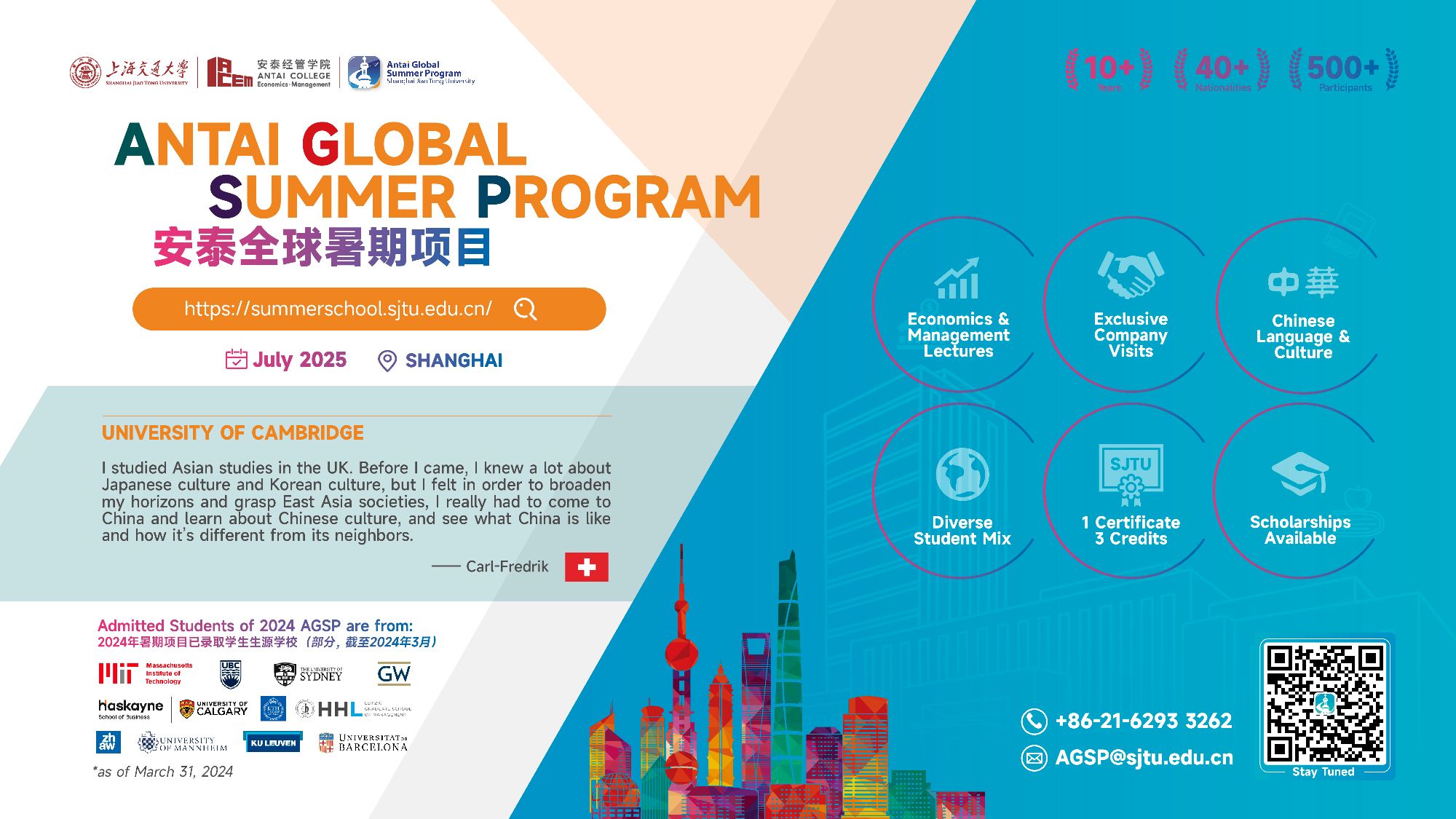 安泰全球暑期项目于2013年开办,是交大安泰开办的首个面向海内外本科生、研究生、在职青年招生的全英文旗舰暑期项目,致力于为项目学员提供沉浸式了解“中国商务与文化”和促进国际交流的平台。同时,AGSP也是学院进一步拓展多渠道学生交流和创建国际化平台的重要举措。创办至今,AGSP项目受到外籍学生、海外华侨华裔学生的广泛好评。2025年安泰全球暑期项目(AGSP)将继续于7月举行,项目面向海内外本科生、研究生招生,专业不限,扫描下方二维码,及时获取暑期项目的最新消息,报名线上说明会。
