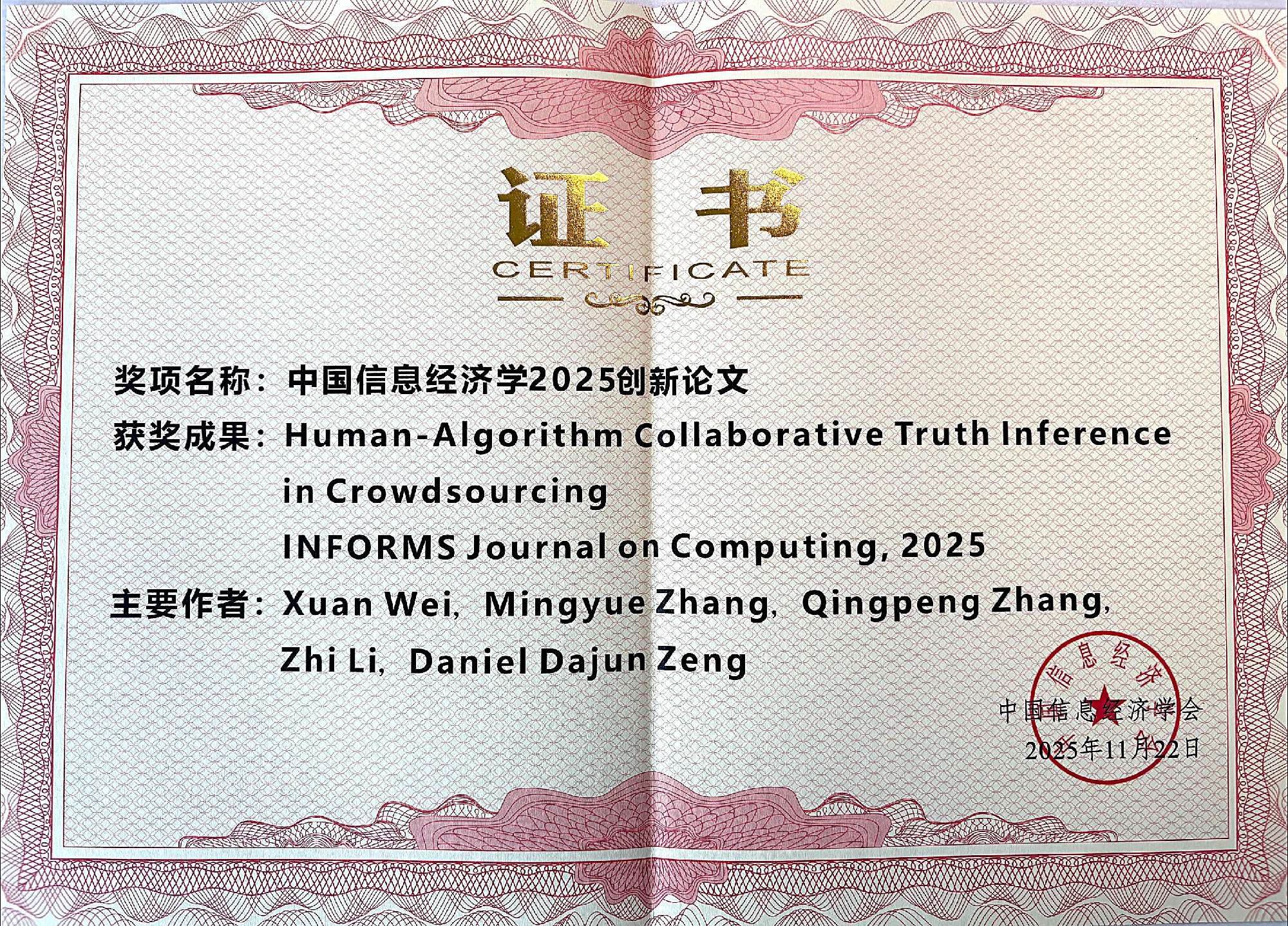 2025年11月21-23日,由中国信息经济学会主办的“中国数字经济与管理学术年会”在海南陵水举行。会上公布了本年度中国信息经济学会“创新论文奖”评选结果。我院陆卓然助理教授以独立作者身份发表于Journal of Economic Theory 的论文《Selling Signals》和魏煊副教授以第一作者身份发表于INFORMS Journal on Computing的论文《Human-Algorithm Collaborative Truth Inference in Crowdsourcing》荣获创新论文奖,并受邀作大会特邀报告。此外,陆卓然助理教授与合作者从佳佳共同撰写的论文《Real-Time Monitoring and Relational Contracts in Usage-Based Insurance》荣获会议最佳论文。