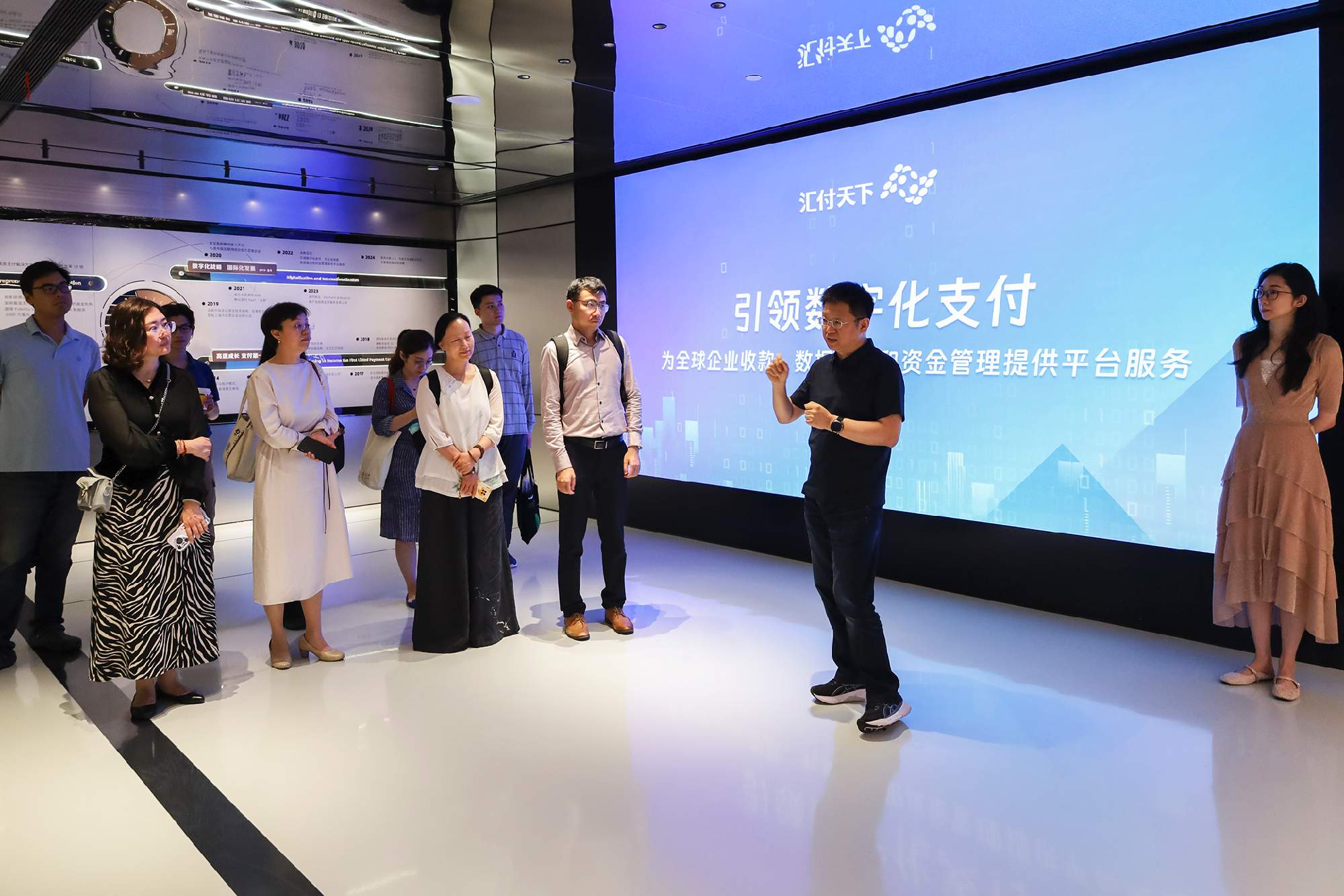 汇付天下CFO金源热情接待了参访师生一行,在金源的带领和讲解下,师生们首先参观了汇付天下展厅,深入了解公司发展历程、核心技术及行业生态布局。汇付天下以中国传统建筑中的“斗拱”为喻,生动阐释了其"支付为基、数据为核、生态赋能、科技驱动"的数字化解决方案。通过构建支付、SaaS与数据的深度融合,支撑商业生态的高效运转,这一创新模式引发了师生对科技金融赋能产业数字化转型的深入思考。