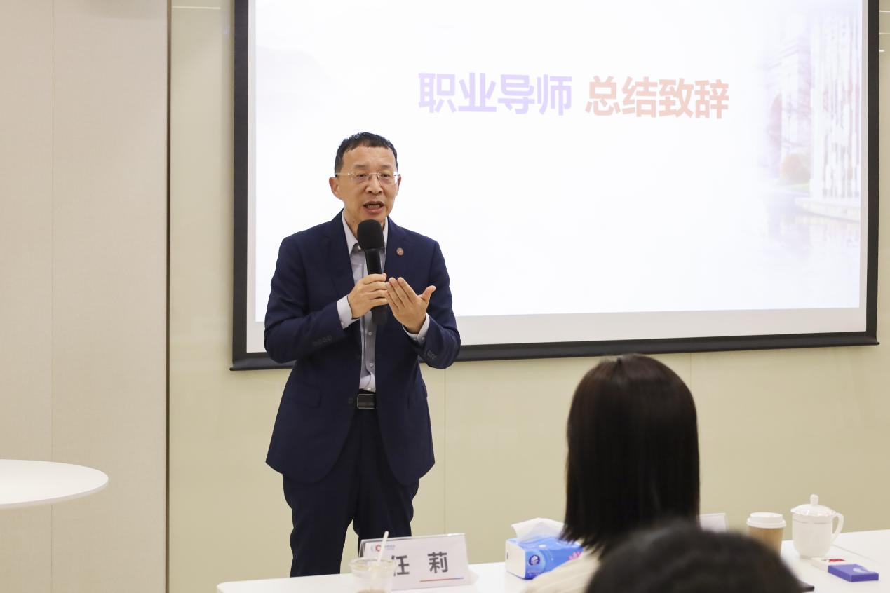 最后,安泰经管学院校友会副会长、职业导师朱伟军对本次活动进行总结致辞。他鼓励同学们将此次参访所学铭记于心,在未来的学习和职业道路上,养成终生学习的习惯,培养独立思考的能力,拥有勇于探索的精神,不断提升自我,为金融行业的发展贡献力量。